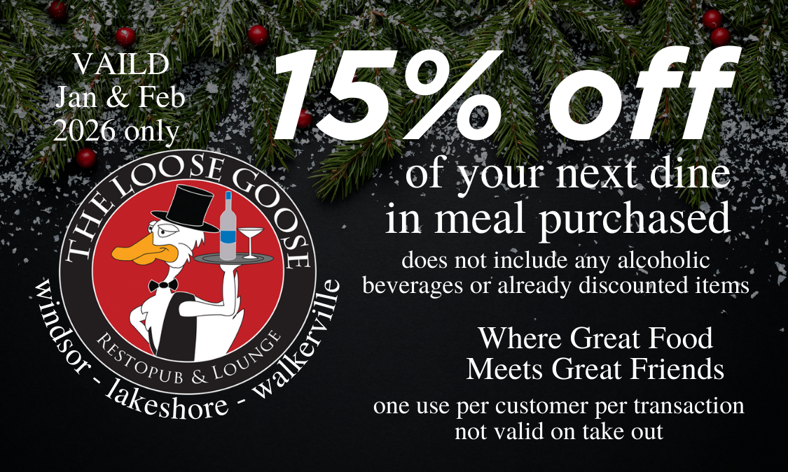 Did you order take out last month? Then you probably got a 15% off coupon! Now is your time to redeem it. Visit your neighbourhood Loose Goose to take that 15% off your bill. Coupons are valid in the months of January and February. It’s the perfect excuse to get out of the house and enjoy some of your favourite foods at your Loose Goose.
