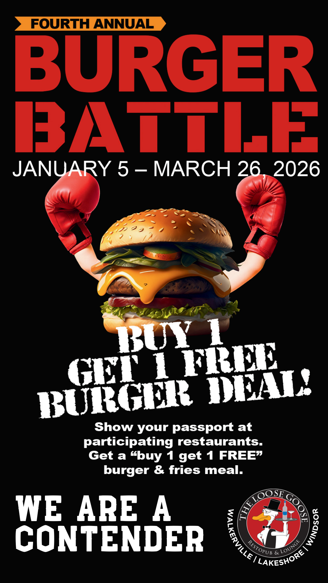 Then starting January 5 running until March 26 - visit one of 15 participating restaurants Monday - Thursday for a Buy One Get One FREE burger! You must purchase 2 beverages as well to qualify for the BOGO. This year ALL three Loose Goose restaurants - Windsor - Lakeshore - Walkerville will be accepting Burger Battle Passports and all burgers qualify. Don’t forget to VOTE for your favorite burger! PLUS new contest this year for - Best French Fries!